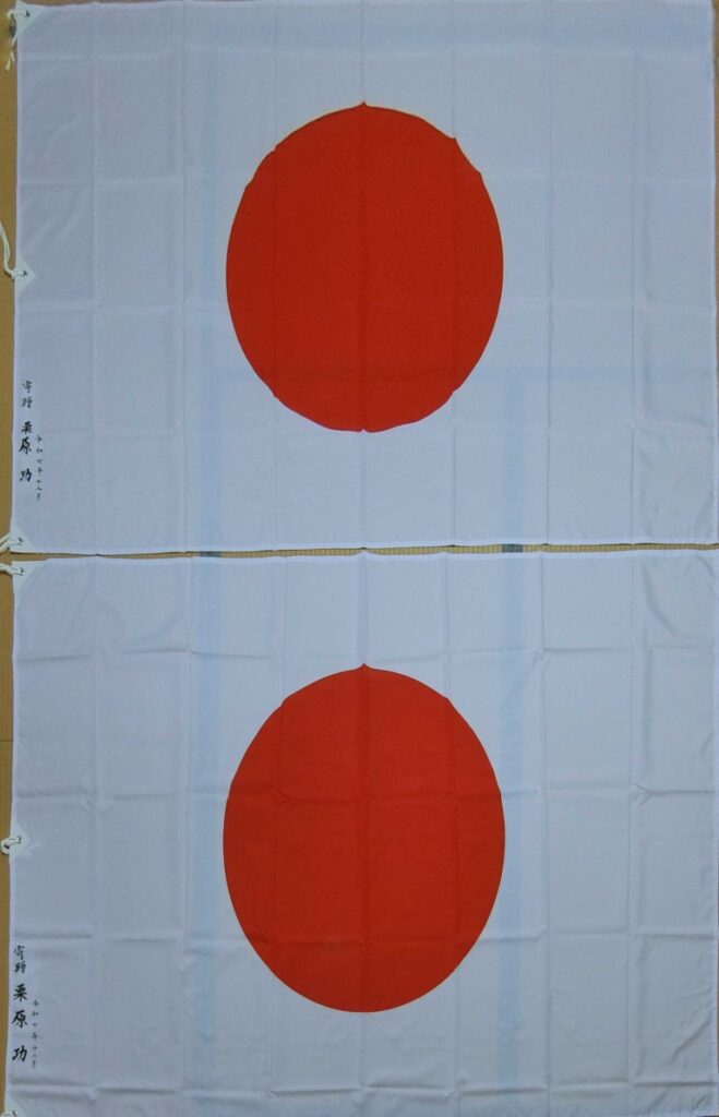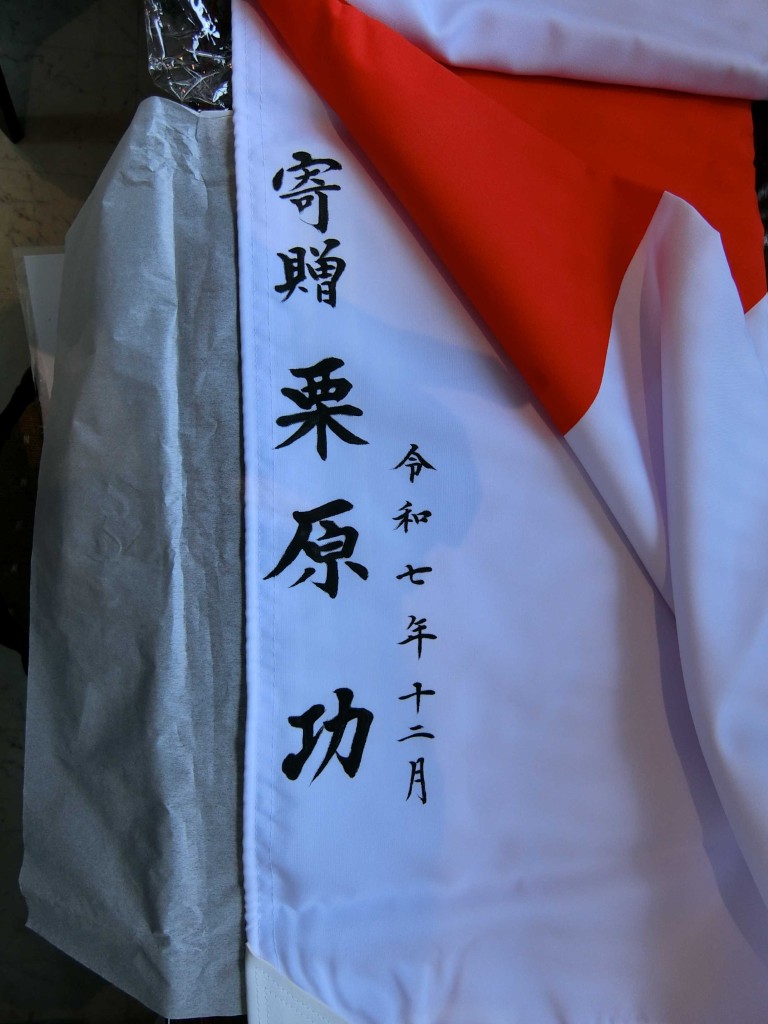 現在使用している旗は、昭和44年(1969年)にご寄贈いただいてから56年が経過し、経年による破損が目立ち始めておりました。この度、取替を検討していたところ、栗原功様よりご寄贈のお申し出をいただきました。この温かいお心遣いにより、新しい「日の丸」(横210cm×縦140cm)を2枚購入させていただきました。栗原様には、長年の奉仕の心を心より感謝申し上げます。新しい旗は、来年の秋季大祭(8月20日・21日)に披露させていただきます。