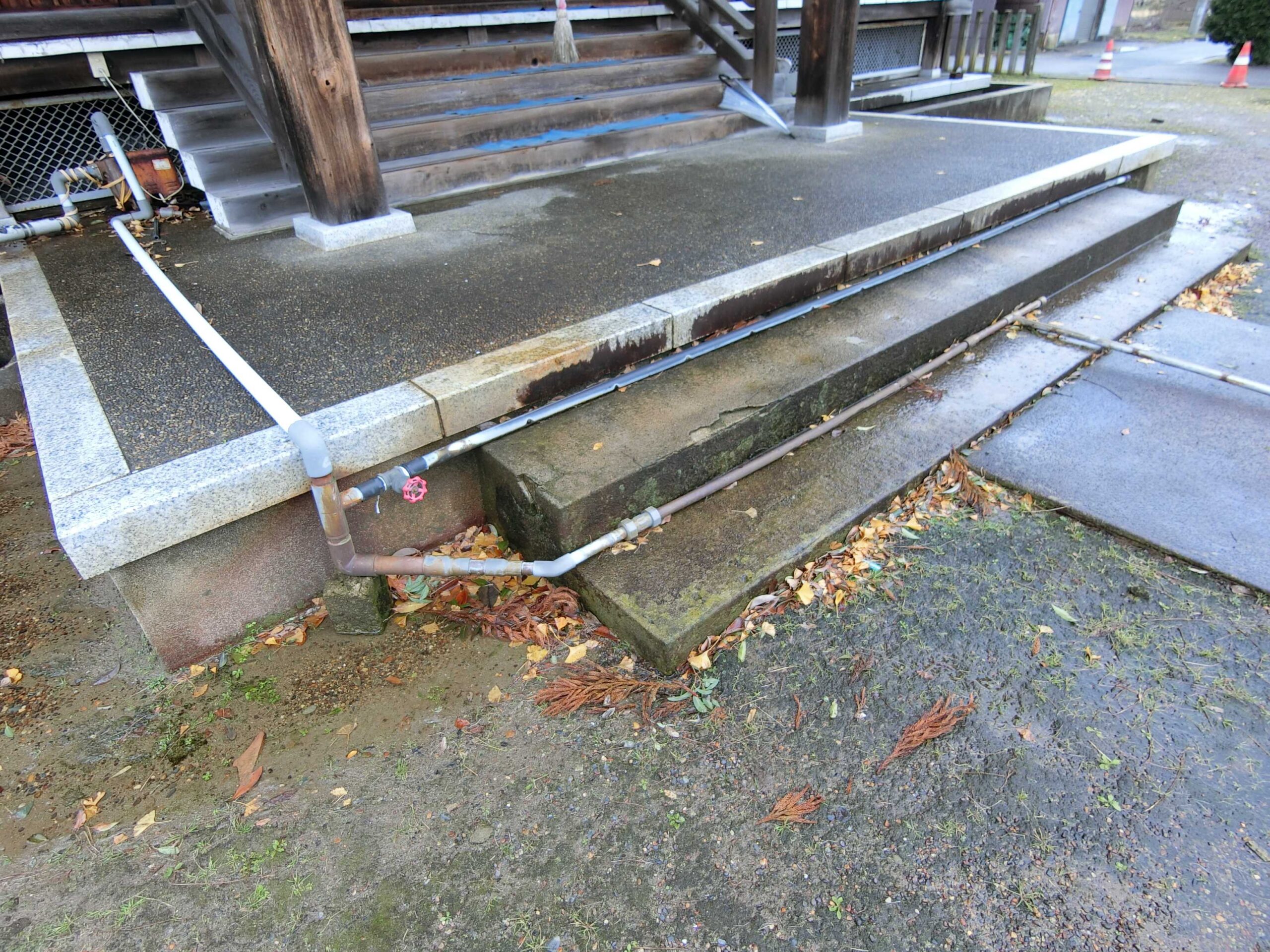これまで設置されていたパイプの破損や消雪ポンプの著しい錆など、経年劣化が進んでおりましたが、この度、株式会社 禎招(ていしょう)工事様のご協力のもと、配管とポンプを全て一新いたしました。これで大晦日からのお正月にかけて降雪があった場合も安心です。凍結や積雪の心配なく、皆様を気持ちよくお迎えできます。二年参り、初詣のご参拝を心よりお待ちしております。